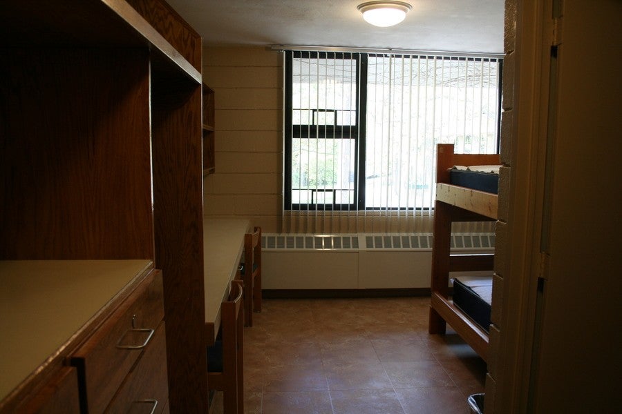 Camp staff rooms in Thor Johnson are double occupancy bedrooms with bunk beds and a semi-private bathroom between two adjoining bedrooms.