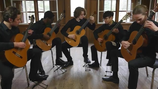 Watch as the Interlochen Arts Academy Guitar Ensemble students performs a five-guitar version of Paulo Bellinati's 1997 "Baiao de Gude."
