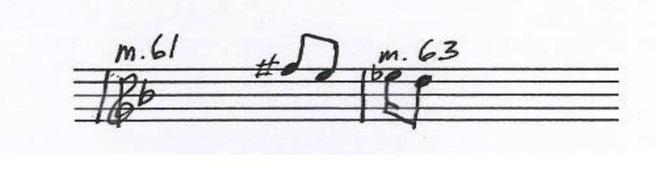The variance in Griepenkerl´s upbeat to m. 61 is not so much a note-text variant as it is a more closely filled-in embellishment device of passing tones between intervals of a third, within the outline of the diminished seventh chord. The addition of passing tones is a valid traditional performance usage where the musical structure merits or suggests it. But this kind of addition must relate to the context of the larger phrase, not solely a single figure in isolation. These thirty-second note values, combined with anticipating the entry of the seventh degree and the rhythmic stoppage at the arrival of the figure on a single held quarter note at the first beat of m. 61, do not take into account the ongoing nature inherent in the original triadic and eighth-note figuration. Moreover, instead of the magnetic pull of the moving eighths into the semicadence, C# minor – V-I, at beats two and three in m. 61, Griepenkerl´s modification halts the rhythmic advance and subducts the energy of the harmonic arrival. The original two repeated eighth notes are composed to point up the linear peak with a continuous rhythmic flow. These two repeated eighths are different from the repetitions created by Griepenkerl in previously added grace notes. Those constitute sheer repetitions based on the notion that repetition per se projects emphasis and usually creates a static effect. Here at m. 61, the repeated eighths serve as an active rhythmic device interwoven with the larger harmonic phrase that continues through beat three. Curiously, Griepenkerl here rejects the single case of outright original repeated notes.
