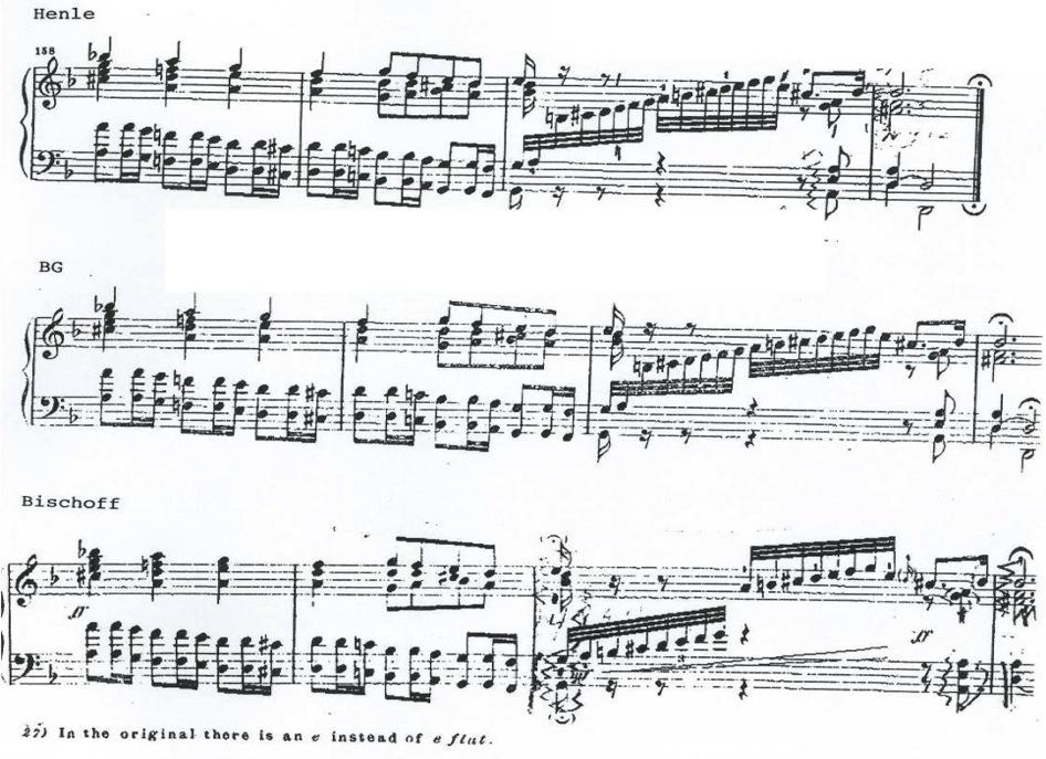 The device of large and small typeface for distinguishing editors´ entries from the original note-text became a frequent practice throughout the nineteenth and twentieth centuries. Kollmann inserts the “small Notes” on the staff alongside the “large Notes”. Griepenkerl and most later editors had their added versions printed above the staff. These came to be viewed, quite wrongly, as legitimate variants stemming from primary sources.