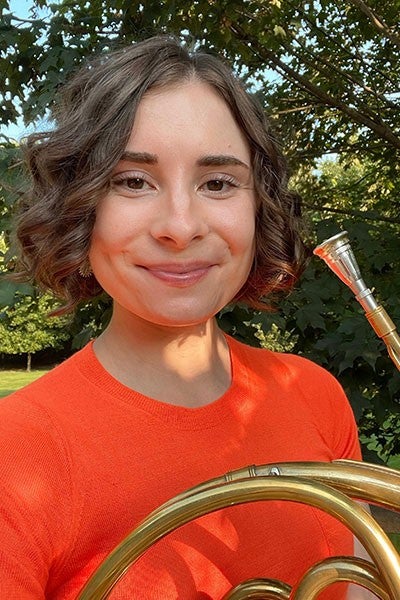 Christine Stinchi, hornist, is a doctoral student at Rutgers University, studying with New York Philharmonic’s Richard Deane. Stinchi is on horn faculty at Interlochen Arts Camp. Stinchi’s article, “The Hunting Horn Topic as a Bridge Between Two Horn Sonatas” will be featured in a 2023 publication of The Horn Call. Stinchi is also part of a female horn quartet that performed at the 51st International Horn Symposium in Gent, Belgium, in 2019. The quartet is currently launching a series of performances that will feature both classical and contemporary music covers, from Mozart and Ella Fitzgerald to The Weeknd and Taylor Swift. Stinchi earned her Master of Music in Horn Performance from the University of Maryland and bachelor’s degrees in horn performance and music education from the University of Michigan. Stinchi is also a graduate of Interlochen Arts Academy.
