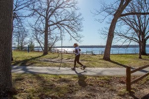 A runner participates in the Run for the Arts 5K on Interlochen's campus.